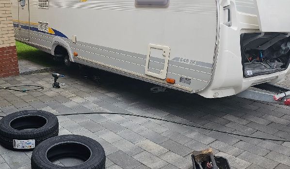 48268 Greven, Wohnwagen Trailer Reifenwechsel auf einem Parkplatz