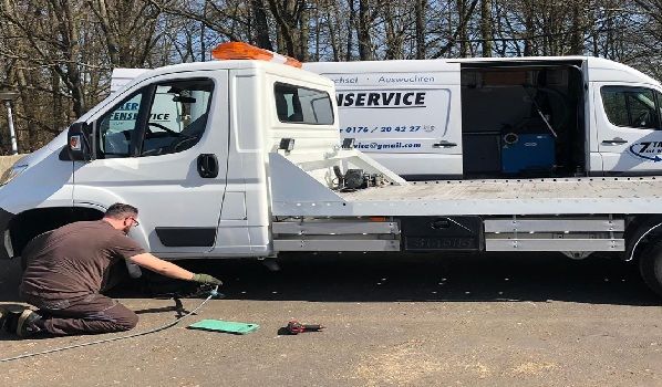 33803 Steinhagen/Westfalen, mobiler Reifendienst mit plattem Reifen auf dem Parkplatz