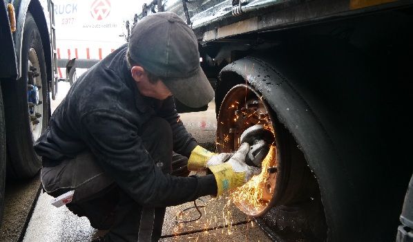 18516 Süderholz, Auflieger Felgenwechsel, entfernen des festgerosteten Rads