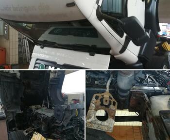 Der Scania wurde zu uns abgeschleppt, da seine Achse gebrochen ist.
