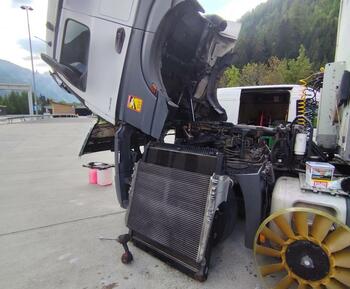 Beim Actros in Österreich bei Wien ist der Kühler geplatzt. Unser mobiler Pannendienst ist rausgekommen und hat den Kühler fachgerecht vor Ort gewechselt.