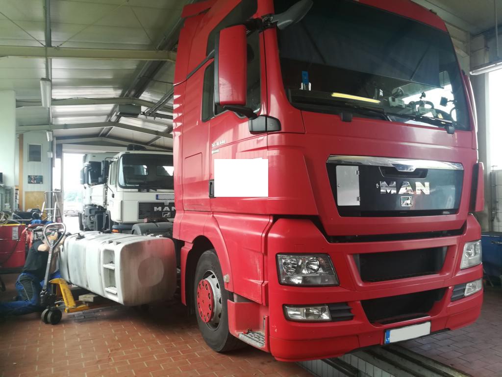 Ein Kunde in Würzburg hatte Probleme mit dem Kraftstofftank seines MAN TGX, also schleppten wir den LKW zu unserer Werkstatt nach 97618 Niederlauer und inspizierten Ihn. Erst wurde der Tank geleert, entfernt und von außen und innen gereinigt, bevor wir die Risse ausfindig machen konnten. Wir schliffen die betroffenen Stellen ab und entfernten die Rostflecken, bevor wir sie mit Rostschutzfarbe überstrichen und eine Schicht Dichtungsmittel auftrugen. Schließlich wurde der reparierte Tank wieder angebaut und mit Kraftstoff befüllt.
