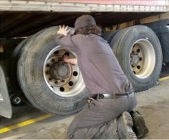 Tire fitting of a Schmitz-Cargobul semi-trailer of a Mercedes Benz Actros truck in Hamburg, Germany.