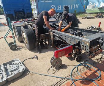 Autowelt GmbH 97618 Niederlauer, Germany, was approached by a customer who had purchased a DAF truck chassis. In order to hitch a two-axle 60cm³ JUMBO tandem trailer to the vehicle, he needed to install a lower hitch (towbar) and move the electrical