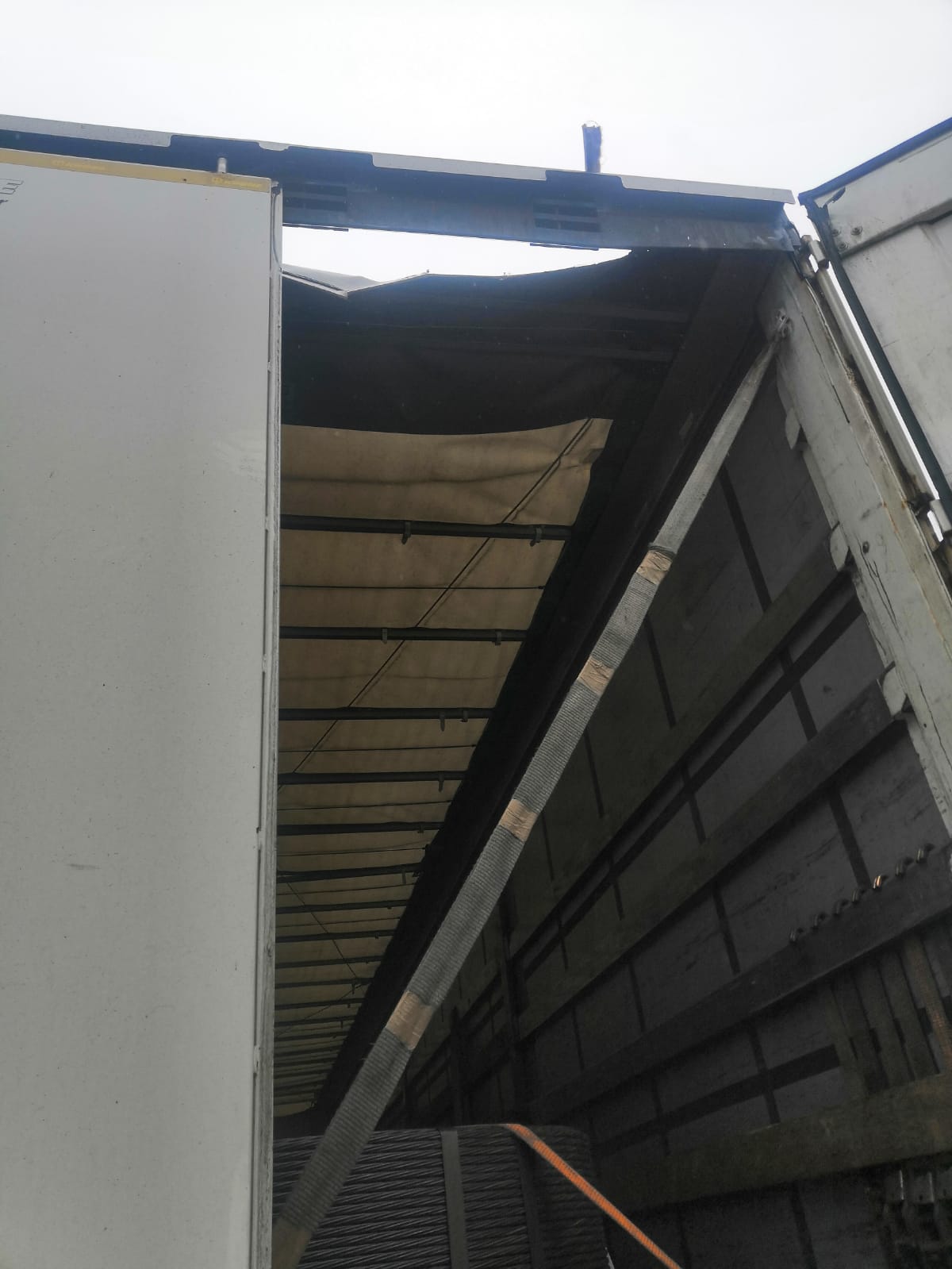 Plandeka przyczepy Krone została poważnie uszkodzona. Deszcz może uszkodzić ładunek, a prędkość i wiatr grożą rozerwaniem plandeki ciężarówki.